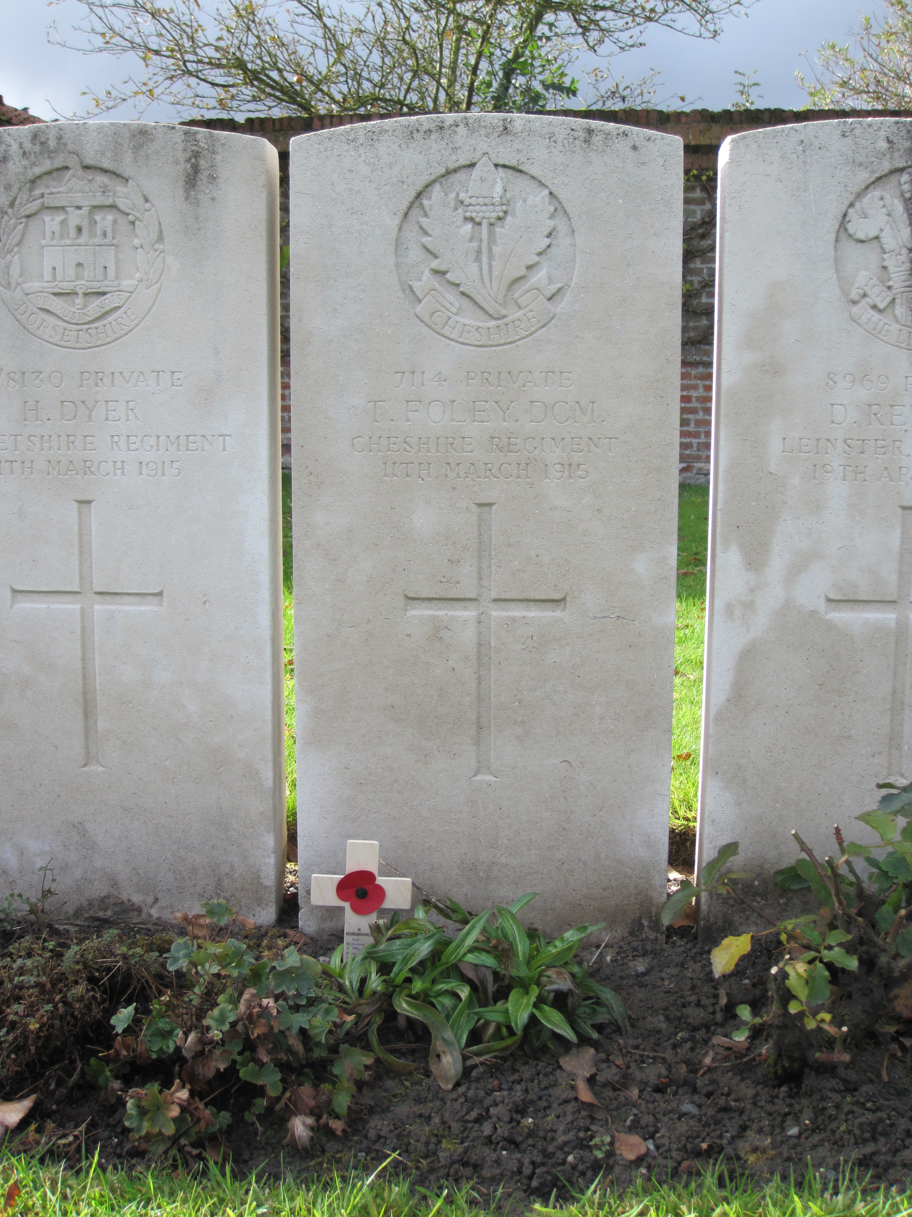 Grave of Pte Thomas Foley DCM, 7114, 1st Battalion The Cheshire Regiment, Poperinghe Old Military Cemetery