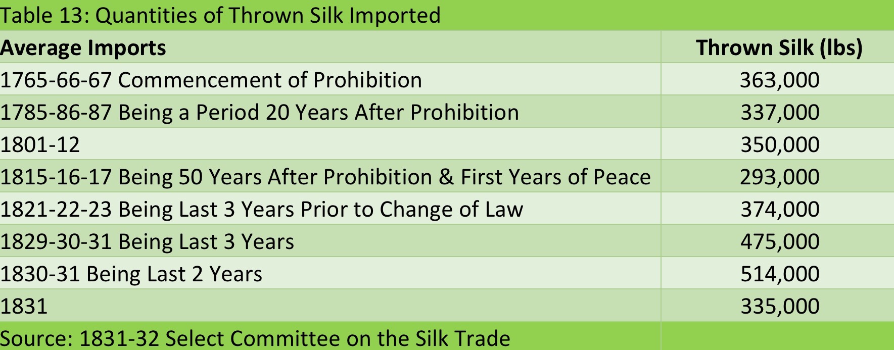The effects of the 1820’s legislation relaxation can be seen in Table xxxx, with the increasing weight of thrown silk imports which in turn took jobs away from English throwsters. The main issues with competition included: