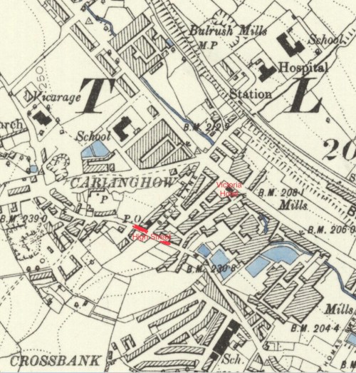 ….partially filled with houses and small shops, built in a straggling manner; and directly opposite the butcher’s shop in question, where Miss Wrigglesworth resided and carried on business, there is a respectable-looking cottage house, one storey high. Nearly opposite is the Lord Nelson beerhouse [this, according to police evidence, had closed promptly at 10pm on Sunday night] and some cottages, evidently occupied by colliers or mill workers. Above the butcher’s shop are some newly-erected ones, used for various purposes. The main point of interest is a small shop which has been erected close to the gable of the house, which forms one of a row of three – two-storied old cottages – and in the one at the end nearest the road lived Miss Wrigglesworth…. [5]