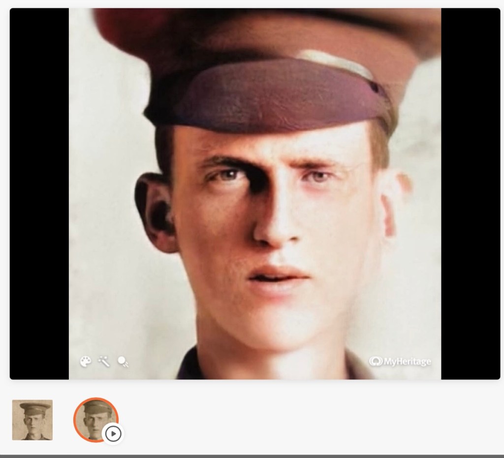 It’s a clever piece of wizardry, and really does bring your still images to life in a weirdly compelling way. It is easy to use and the results are shareable. Here are a couple I’ve done. The first is of Jesse Hill, taken in around late 1914/early 1915, who I wrote about here and here.