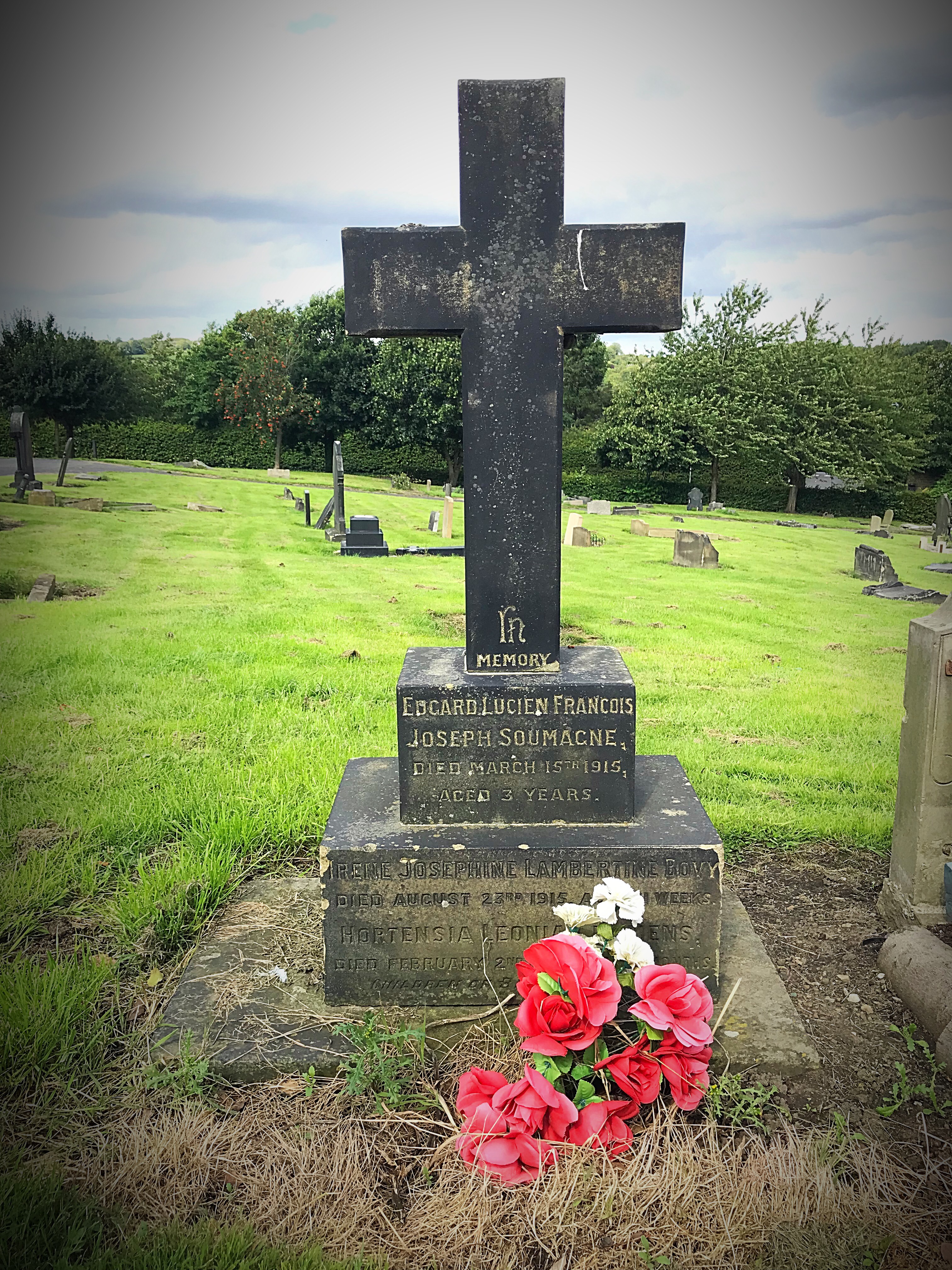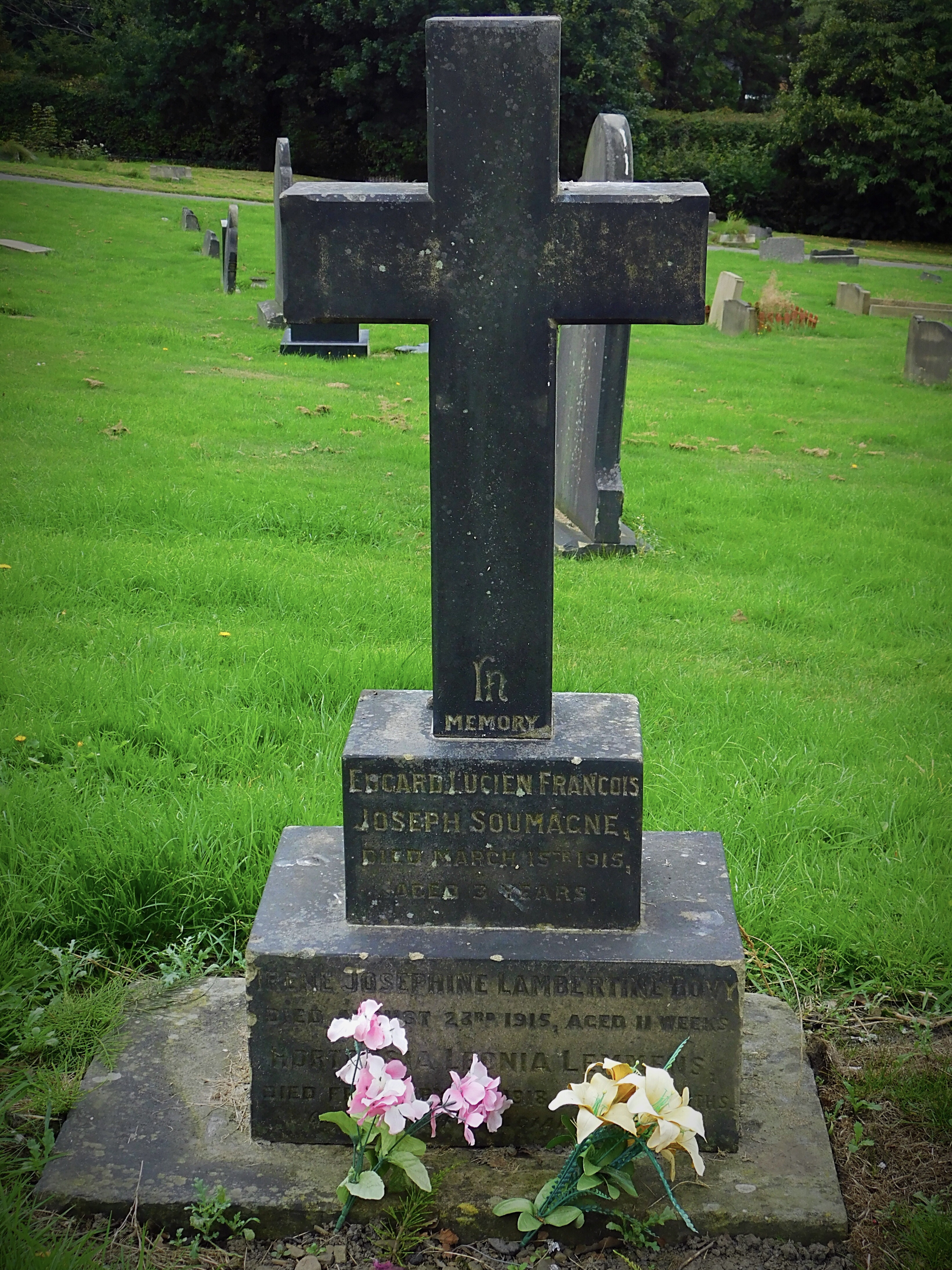 And it was the youngest Soumagne child who was the first young refugee to be buried in the grave in Batley cemetery, in a plot purchased by the local Belgian Relief Committee. Forty-year-old Antwerp nickel-plater Lucien Soumagne, his 43-year-old wife Marie, and children Jean Joseph (19), Lucien (16) and Edgard Lucien (3) were amongst the original nine Woodhall residents who arrived at the house in November 1914.11 Mr and Mrs Soumagne had prominent roles within the Batley Belgian community, liaising with authorities and seemingly acting as spokespersons in particular for the Woodhall refugees. The family were non-Catholics, which may partly explain why this burial plot was purchased in the Consecrated Church of England portion of Batley cemetery.