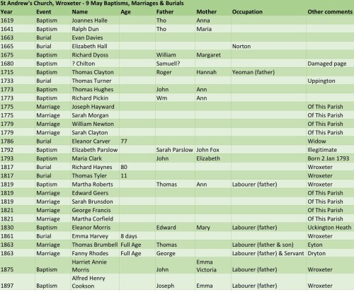 St Andrew’s Wroxeter 9 May Marriages, Baptisms and Burials – Source: FindMyPast