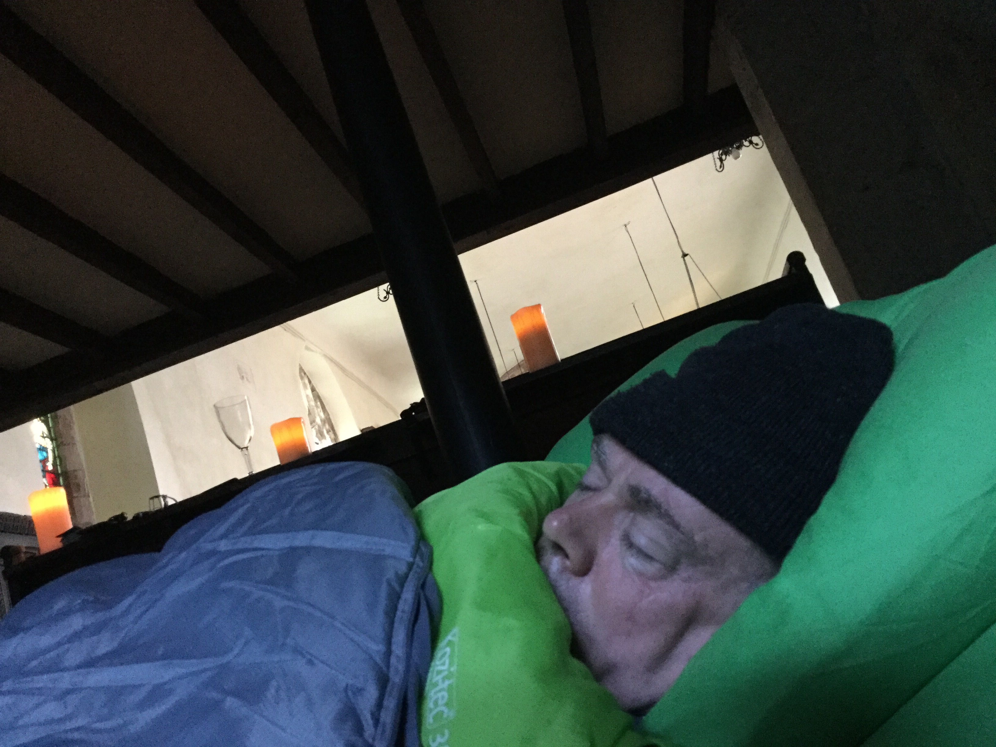 St Andrew’s was all ours between  6pm-10am. In the intervening period it was open to visitors. One very bemused couple did turn up at 6pm – we hadn’t got round to locking the door. They were very confused to see us preparing to take up residence. Perhaps we were squatters? Or had we bought the church to convert to a house,  and lived there during the renovation work? They had never heard of Champing, and were fascinated to have stumbled upon a pair of aged Champers. They even joined us on our champagne hunt. So all a bit of a laugh.