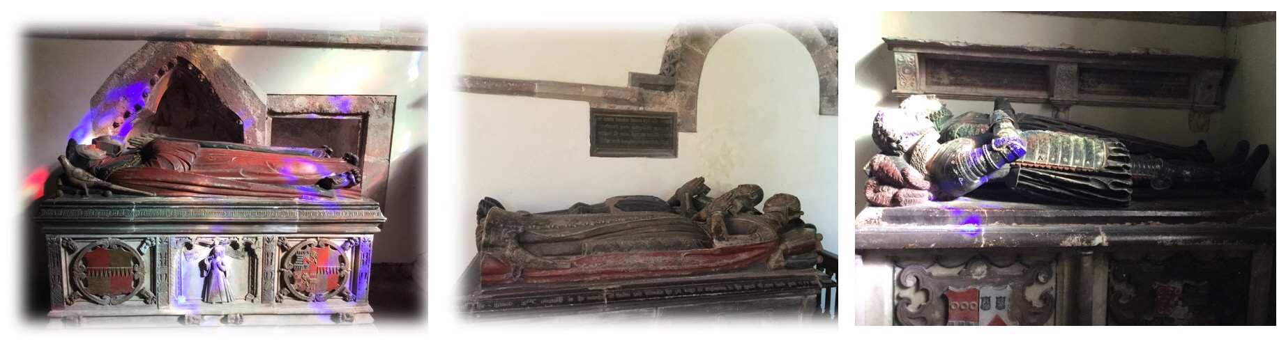 Tomb Chests of Sir Thomas (d1555) and Mabel Bromley; Sir Richard Newport (d1570) and wife Margaret (d1578) and John Berker (d1618) and wife Margaret, bathed in Stained Glass Light – Photos by Jane Roberts