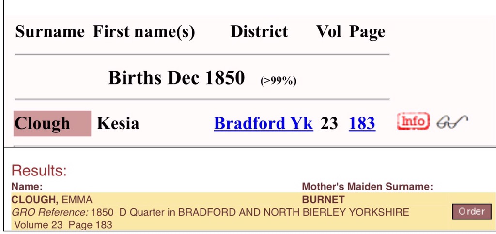 Similarly the 1851 census has no indication of multiple births either. In terms of the couple’s children, Jane (15), William (incorrectly entered as 18 – he was born in 1837) and Ellen (9) are recorded. However, it appears from the GRO Birth Indexes that Ellen was a twin too. Her birth is registered in the same quarter at Dewsbury as an Eliza Gibson, mother’s maiden name Rylah.