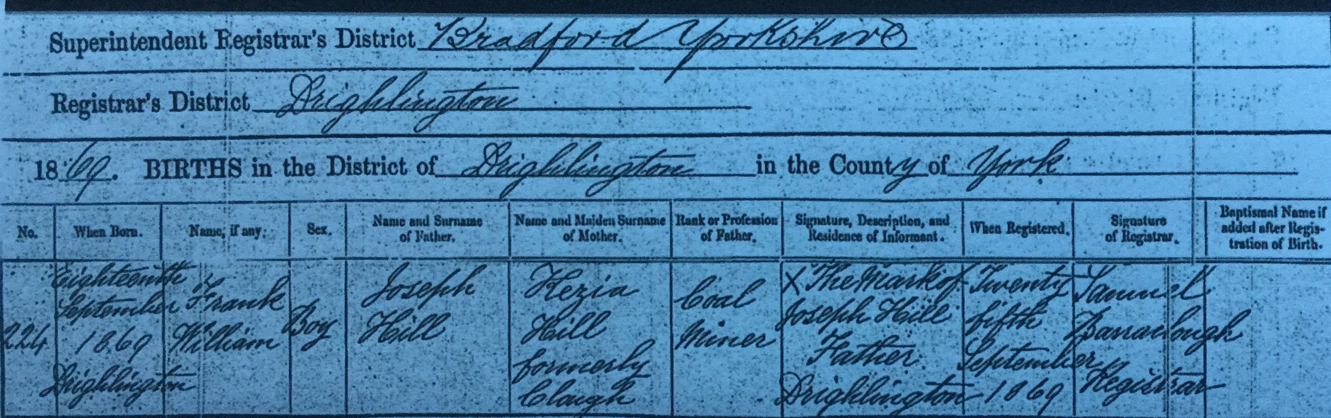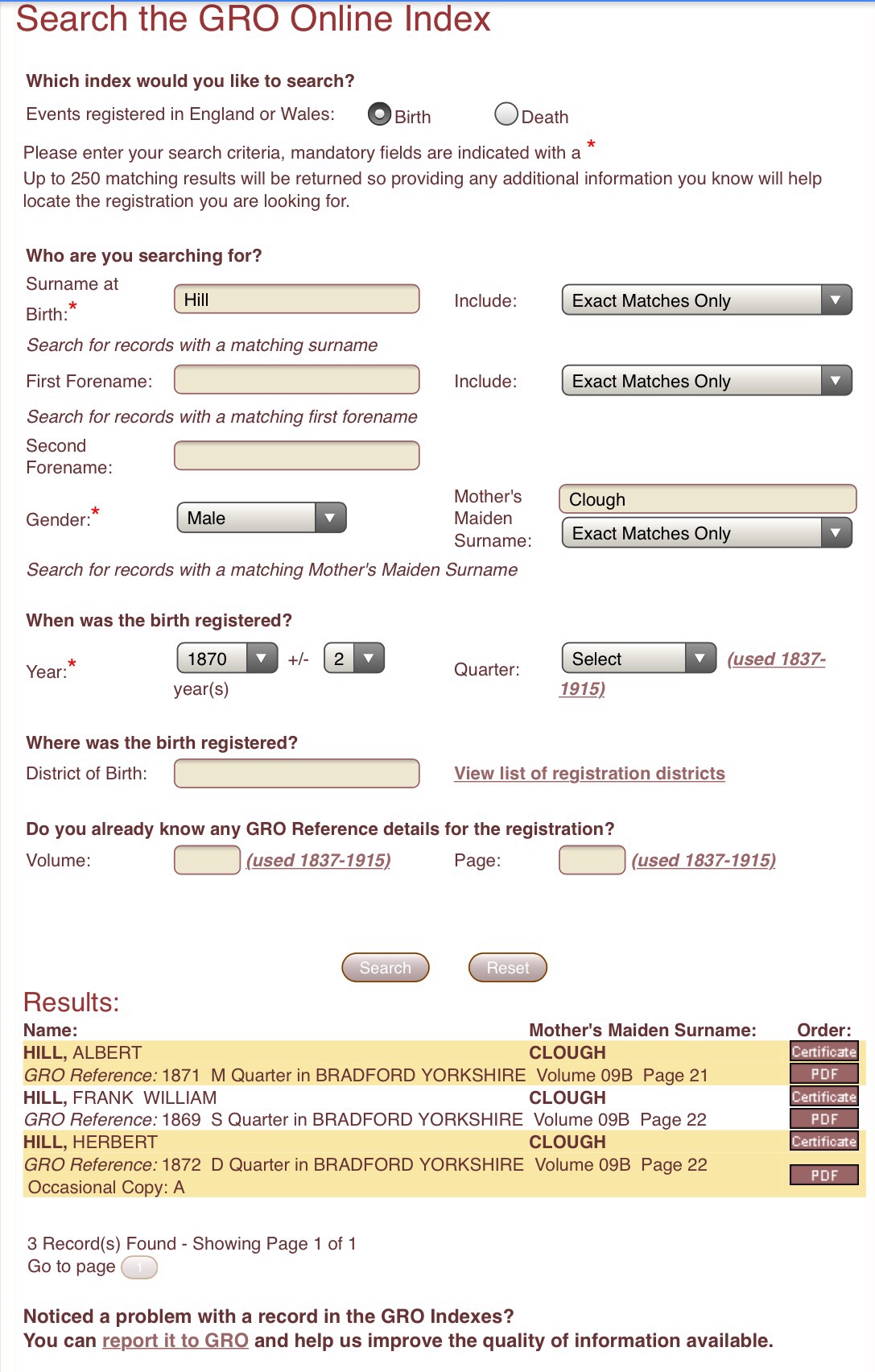 - GRO Birth Indexes, William Gibson. December Quarter 1837, Dewsbury, Vol 22, Page 52 via the General Register Office website, https://www.gro.gov.uk/gro/content/certificates/