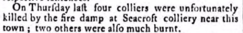 There is nothing to indicate any other Whitkirk burials of the period applied to these victims. Parishes adjoining Whitkirk were Leeds, Swillington, Rothwell and Barwick in Elmet. Leeds St Peter’s parish church provides a cause of death for all burial entries for the period. Sadly I drew a blank in this search. Likewise for Swillington St Mary’s and Holy Trinity at Rothwell. However, Barwick in Elmet All Saints register records the burial on 17 May 1781 of 33 year old Christopher Dickinson from Lowmoor. He died on 16 May 1781, “kild in Seacroft coalpitts“. So was this the same incident? If so it indicates the inaccuracy of the newspaper date which implied a 17 May accident date.