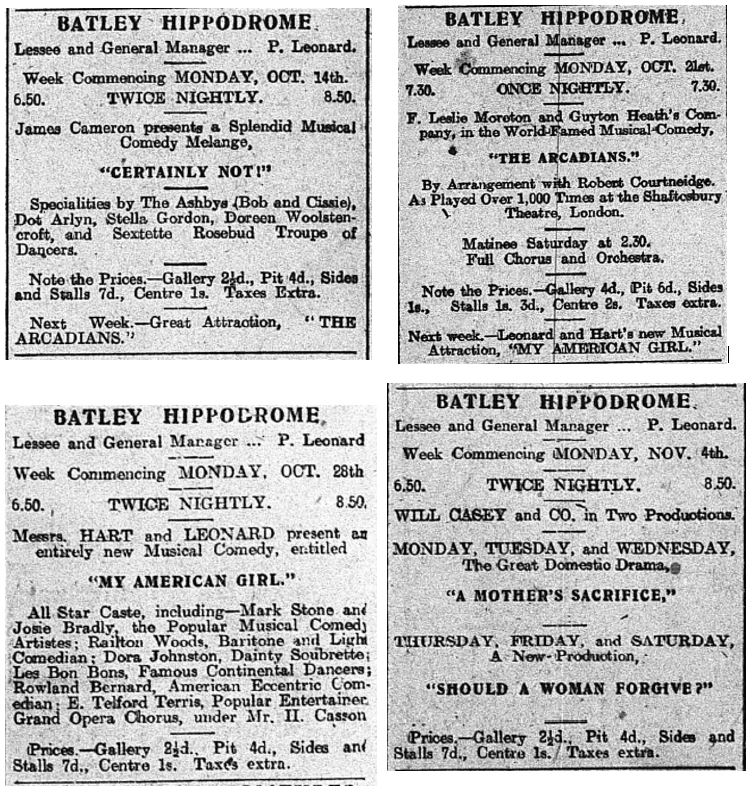 Located in Batley, West Yorkshire. The Theatre Royal opened on 2nd November 1896. It was designed by architect William Smelt and had 3,000 seats in pit, stalls, dress circle and boxes, and was built for Fred Cooke. Alterations were carried out around 1907 to the plans of architect A.J. Whitty. In February 1912 it was re-named Batley Hippodrome Theatre.