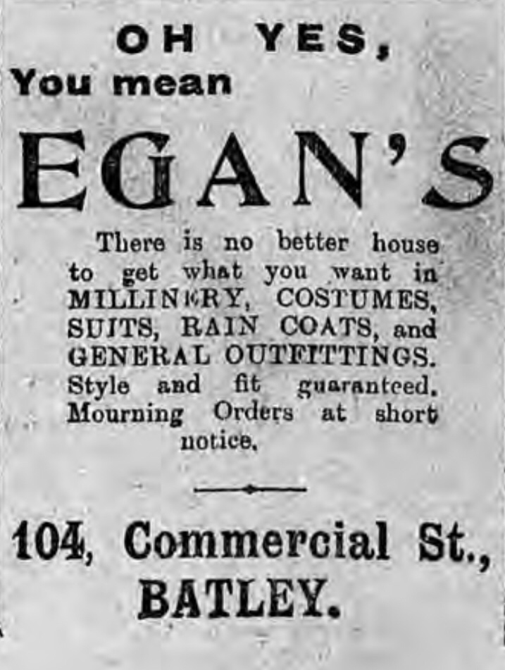 The advert taken from this week’s paper is for the shop owned by parishioner Thomas Egan. Elected as a Liberal Party Councillor for Batley West Ward in 1904, he later became President of the Batley Chamber of Trade in 1924, and a Batley J.P. in 1929.