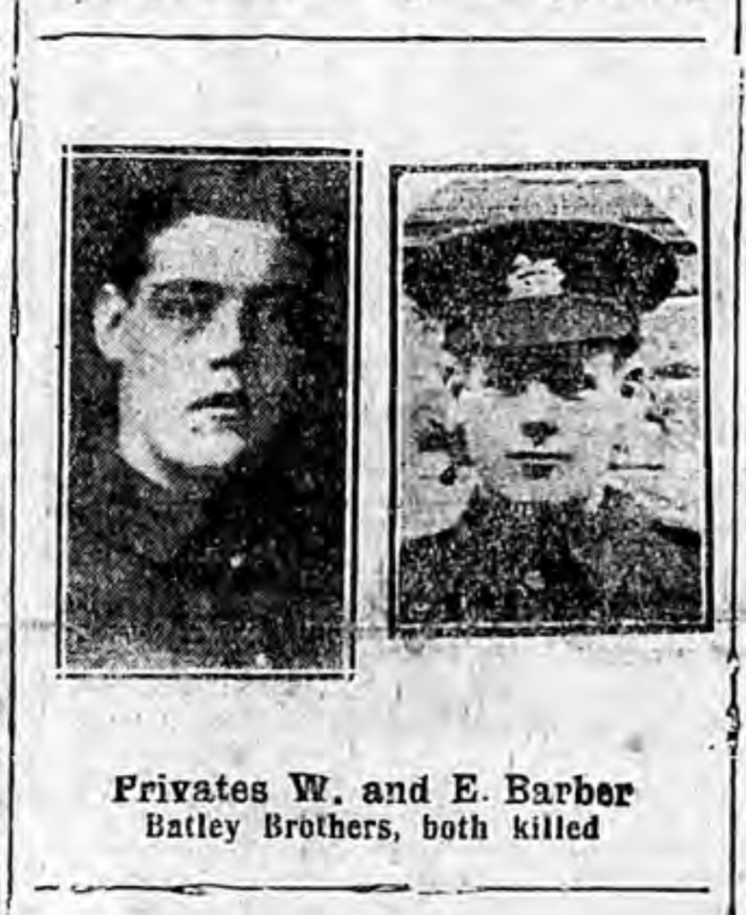 Pte. Willie Barber Struck Down by Bomb.Within seven days of receiving news of the death of their son, Pte. Edward Barber (18), Mr. and Mrs. Wm. Barber, Devon Street, Batley, have received an official intimation that their other son. Pte. Willie Barber, K.O.Y.L.I., was killed in action on July 22nd.