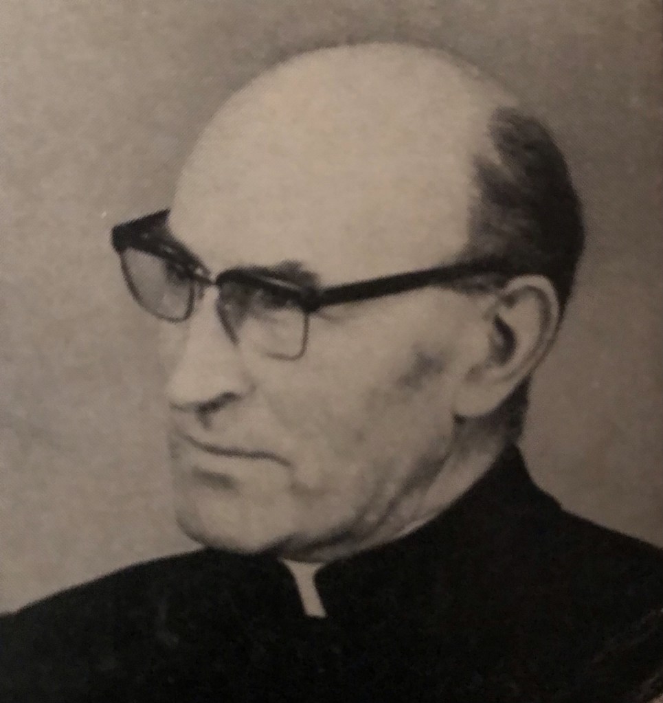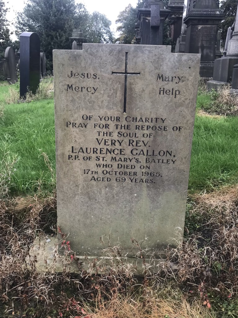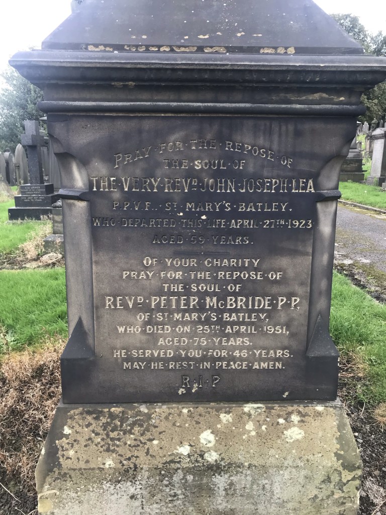 Serving at St Mary’s for 46 years, he died whilst at the home of his brother in Maghera, Co. Derry on 25 April 1951. His body was brought back to Batley, the parish he made his home, for burial. Long after his death, his walking stick was legendary – he used it to rap loudly on the doors and windows of parishioners who were in danger of sleeping in and missing Sunday mass. Mum used to mention this in relation to her parents, who lived in the parish in the mid-1920s.