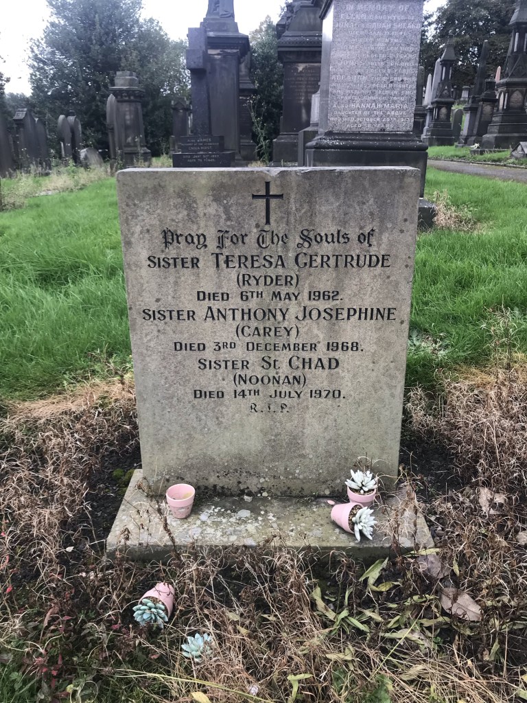 The headstone standing next to Fr. Gallon’s is one remembering three more Sisters of St. Paul nuns. The first name is that of Sr. Theresa Gertrude (Rose Mary Ryder), who taught at St Mary’s school until 1945. Born in Limerick, she came to Batley in 1902. She died in the convent on 6 May 1962, at the age of 82 years, a short time after attending early morning mass.3