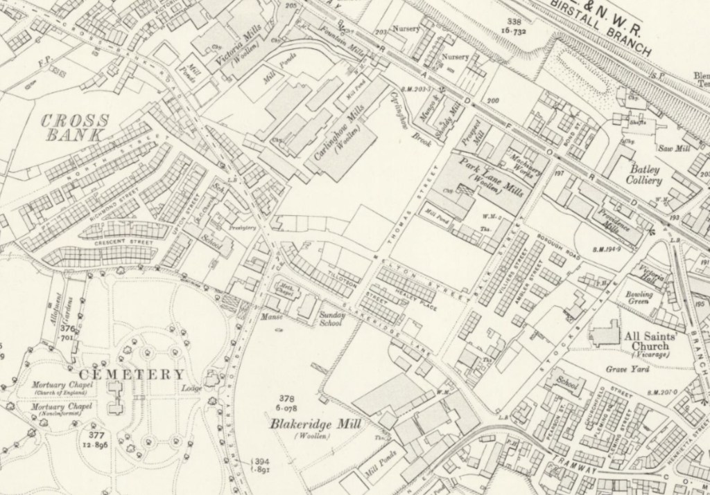 Below is an extract from the 25-inch Ordnance Survey Map of Batley, revised in 1905, and published in 1907. It shows the location of St Mary’s Church, Presbytery, convent and the school buildings.