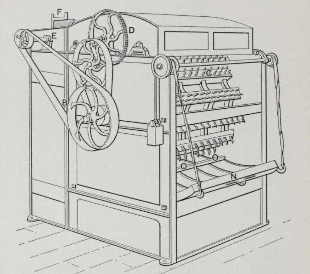 Willeying. Fifty years ago the “teazer” only was in use for opening the wool and mixing or “blending” the material together. Abour the year 1825, the “shake-willey,” a stronger and coarser-toothed machine, was introduced, to open and disentangle the locks of wool and other materials, whilst at the same time ridding them of sand, dust, seeds, and other impurities. The willey consists of an open cylinder or drum, with ten or twelve ribs, on each of which is a row of spikes. Three rollers, each with ten rows of similar spikes, are placed over the drum, so that when the machine is in motion, the spikes on the roller pass through the spaces between those on the drum. By this arrangement the wool is opened, and the impurities fall through the wire grating beneath.5