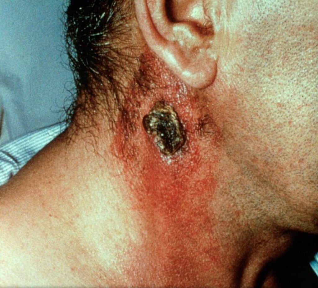 Employed by Messrs. G. H. Wright Ltd., yarn spinners and dyers at Dale Street Mills, Batley Carr, on 18 December Grace noticed a spot on his forearm. He reported it to the foreman willeyer and blender John William Thornton on Thursday 20 December. At the inquest Thornton described it as “something like a boil, the size of a sixpence. It was black in the middle, and red all round.”9 It resembled the Home Office anthrax pictures in the mill. The illustration below shows a typical anthrax lesion, which matches the description given by Thornton.