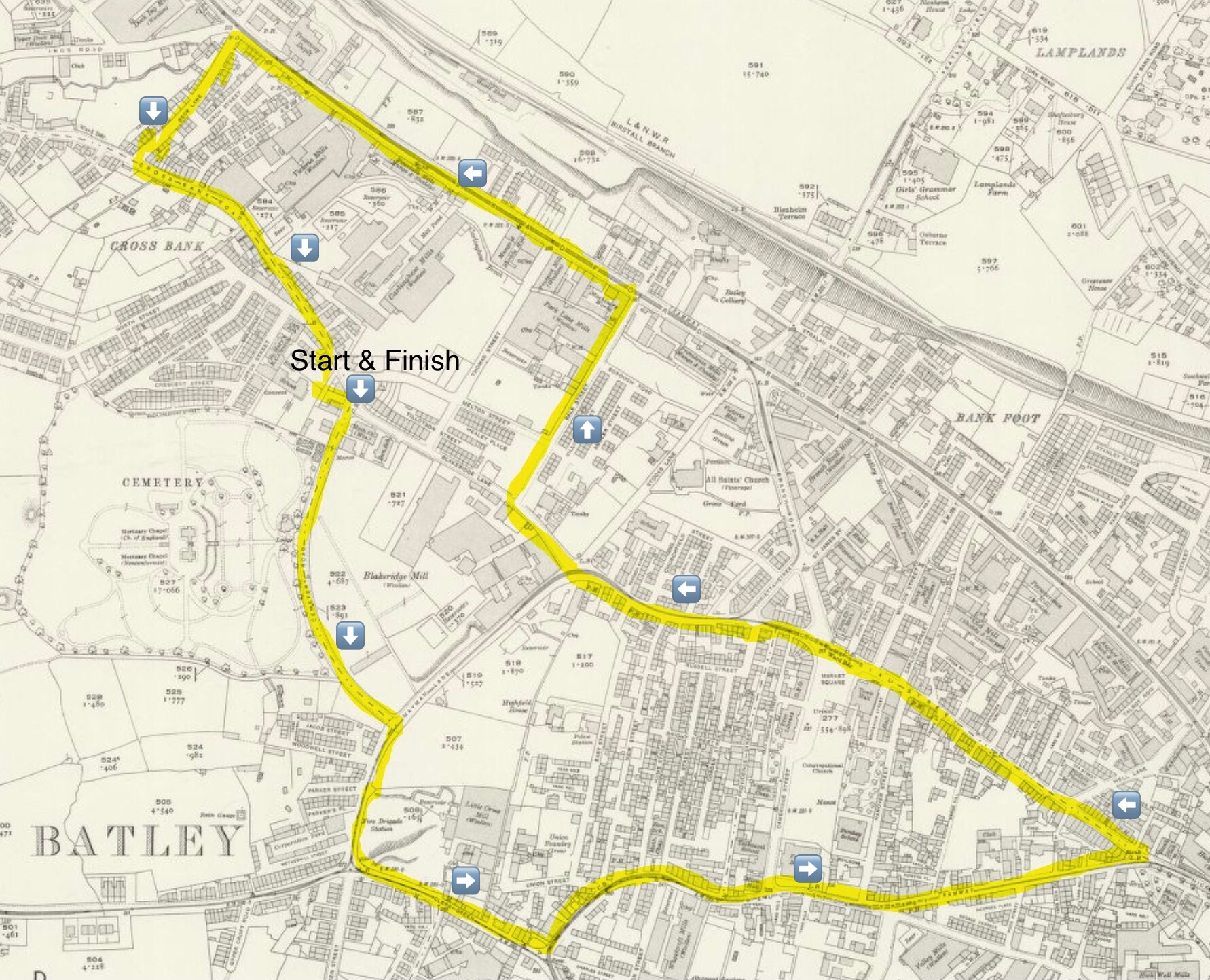 The assembly took place at the schools at Cross Bank, and hymns sung before moving off and on return were “Faith of our Fathers” and “God Bless the Pope.” The route was via Cross Bank Road, Cemetery Road, Mayman Lane, Clerk Green, Wellington Street, Commercial Street, Blakeridge Lane, Bath Street,1 Bradford Road, Beck Lane, and back along Cross Bank Road to the schools. There the children were entertained to a substantial tea and the evening was spent in sports and games, accompanied by music and dancing in a field off Carlinghow, loaned by Major J. P. Critchley, J.P. The happiness of the children was made complete when each one received a packet containing four pence. The day’s expenses were defrayed by subscriptions amongst the parishioners, and the proceeds of a collection taken amongst adults at the field was sent to Batley Hospital.