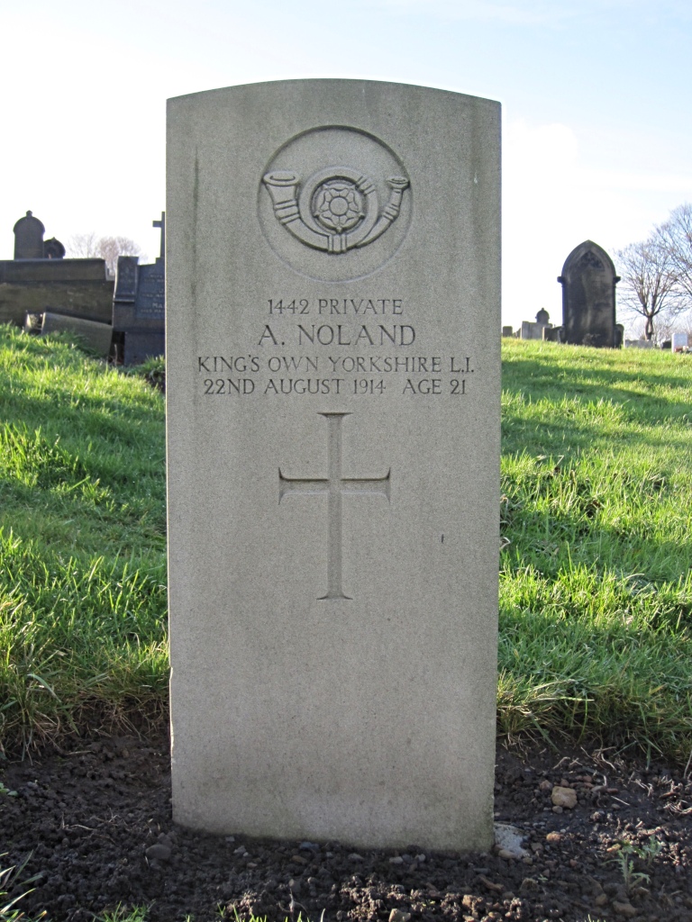 Austin Nolan was born in Staincliffe in 1894. His parents, Parker2 and Ellen Nolan (née Fall), married at St Joseph’s R.C. Chapel, Batley Carr, on 24 July 1882. Parker was from Batley Carr, a stone mason of Irish descent. His bride was from Sherburn, although at the time of their marriage she lived at Staincliffe.