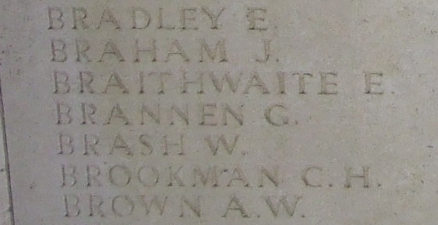 Dominick has no known grave and is commemorated on Le Touret Memorial, Pas de Calais, France, under the name G Brannen. The Commonwealth War Graves Commission records note he was the son of Mark and Mary Brannen, of 6, New St., Batley, Yorks.61