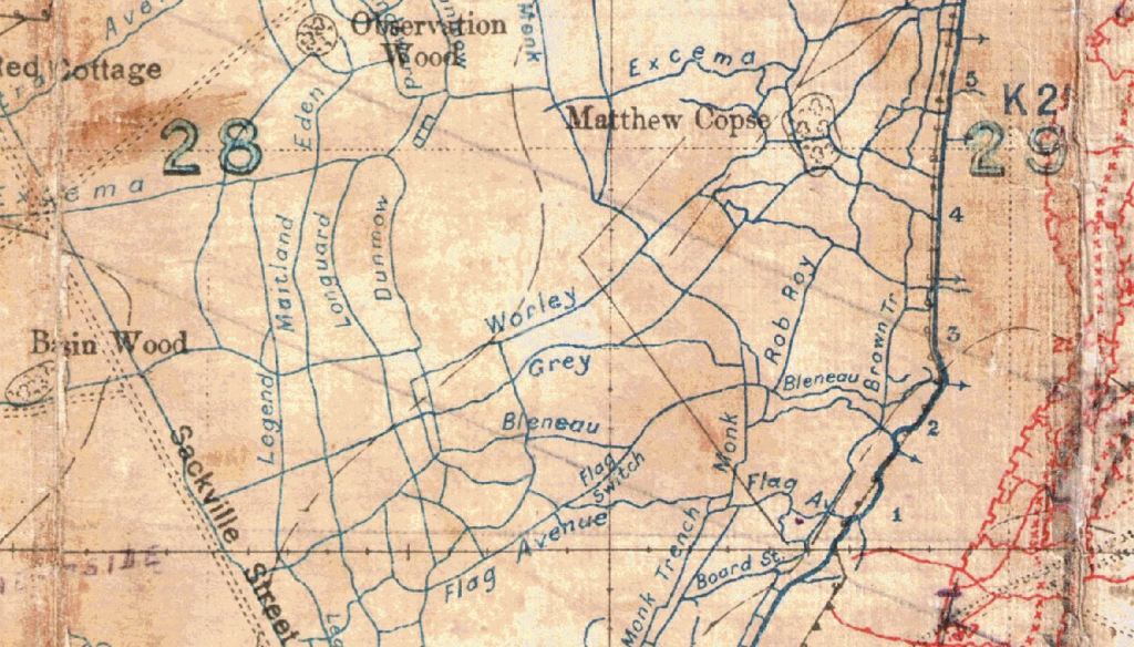94th Brigade’s front (led by the Accrington and Sheffield Battalions) was on the left running along the edge of four copses named “Matthew”, “Mark”, “Luke” and “John”. Their task was to capture Serre village and then to face north-east to shield the northern limit of the Fourth Army attack.