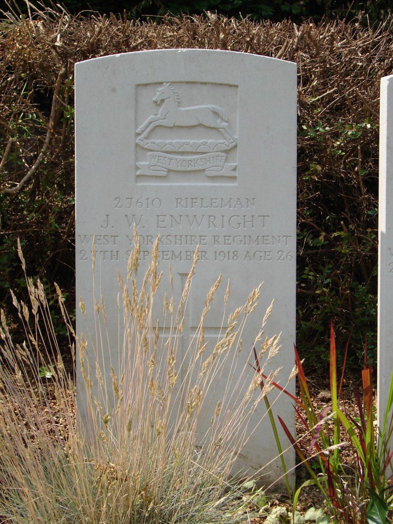 John William Enwright (or Enright as he is recorded on the St Mary’s War Memorial) was born in the Carlinghow area of Batley on 12 February 1892. Baptised at Batley St Mary’s at the end of that month, he was the eldest of Thomas and Mary Ann Enwright’s three children.