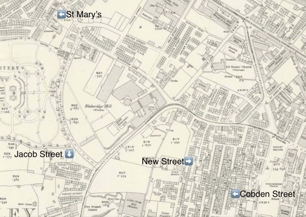 Matthew (Snr), who died in 1899, worked predominantly as a willeyer in a woollen mill. The woollen industry provided employment for others in the family, including Matthew (Jnr). The 1901 census records him working as a woollen cloth finisher. This was also his occupation in the 1911 census, when he and his mother are shown as still living at New Street.