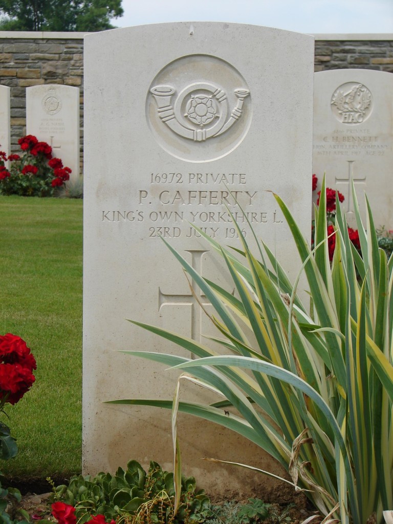It is impossible to imagine the anxiety and loss families went through during the war. And this is illustrated in the Cafferty family. In the space of a few weeks in that summer of 1916, in addition to Patrick’s death, in early July his brother, Thomas, also with the KOYLI, was wounded in the arm. He was in hospital in Norfolk when Patrick died. Thomas did survive the war. However another brother, Michael, was not so lucky. He died days after Patrick, and is also commemorated on the St Mary’s War Memorial. His biography can be read here.