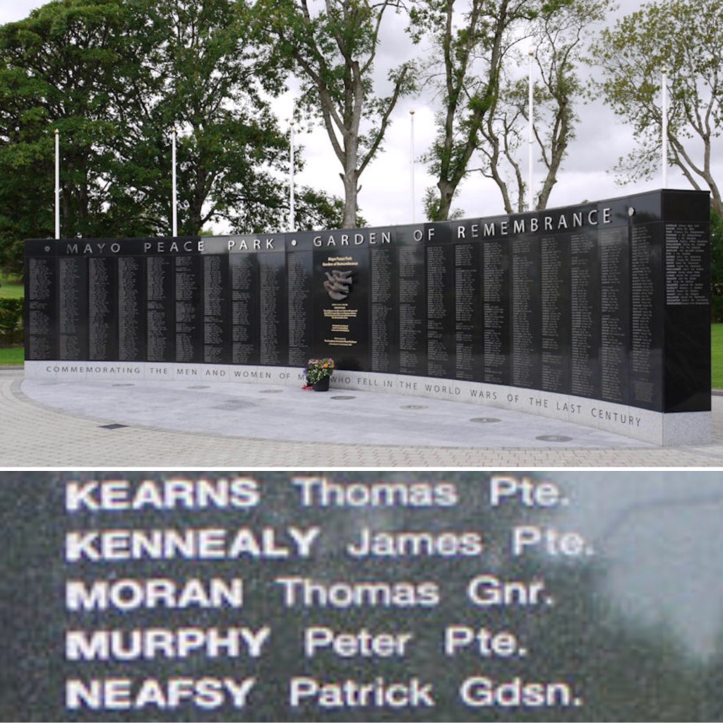He is also honoured in Ireland, both on the Mayo Great War Memorial in Mayo Peace Park, Castlebar and in Ireland’s Memorial Records of the Great War. The eight volumes of the Memorial Records contain details of more than 49,000 fatalities. The men and women commemorated either served in Irish Regiments or were born or resident in Ireland at the time of their death and were serving with units from Britain and its Empire.