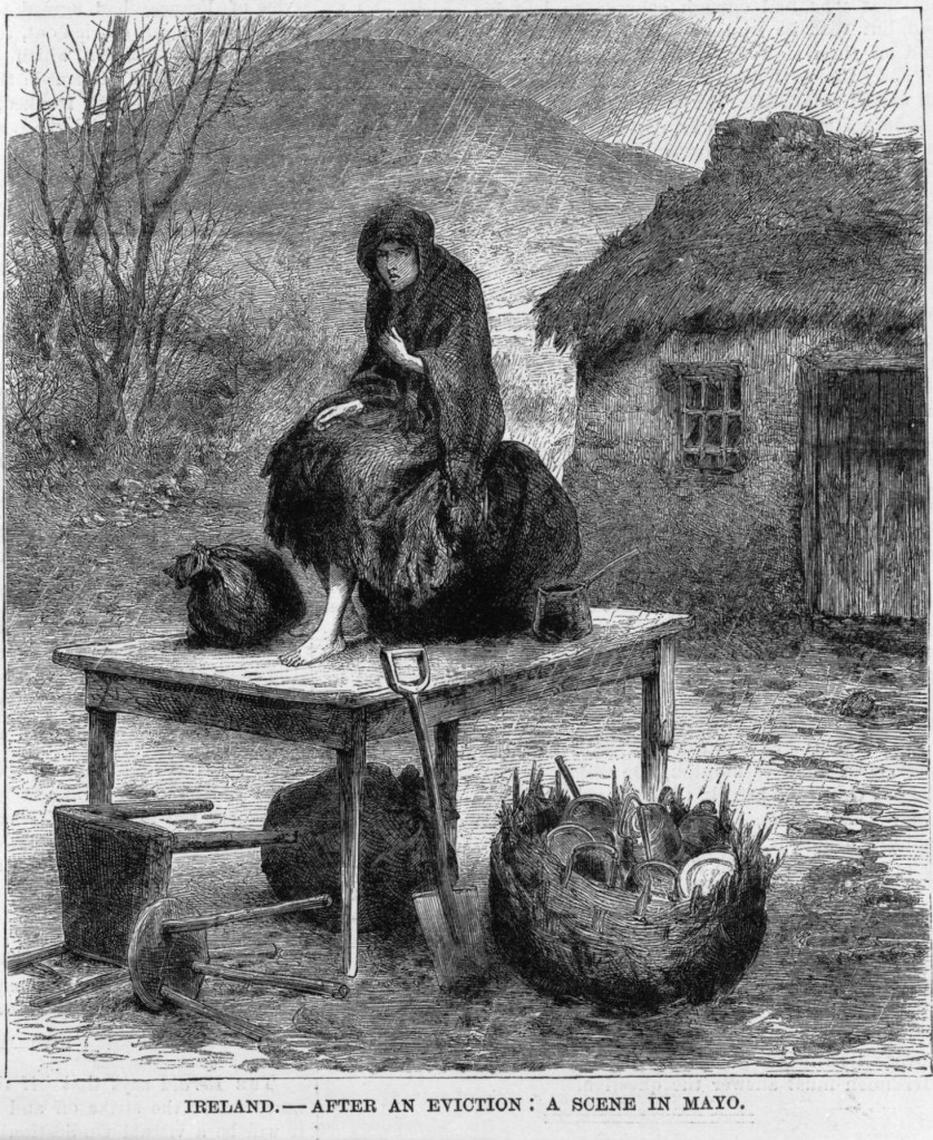 This was the pattern in Ireland – land owned by a small number of landlords, many of them absentee. Rather than farm it themselves they rented it to tenant farmers, essentially tenants-at-will with no security of tenure. These tenant farmers were forced to pay rack-rents – in other words excessive ones. Often, especially in Mayo, the land was too small a parcel to viably farm. Many tenants and their working-age sons, including those on the estate of Lord Dillon in County Mayo, were forced to work on seasonal harvests in England in order to earn money to pay the rents. As a result, they lived under the constant threat of arbitrary evictions, especially in periods of famine, when the rents became simply impossible to pay. And famine was never far away.