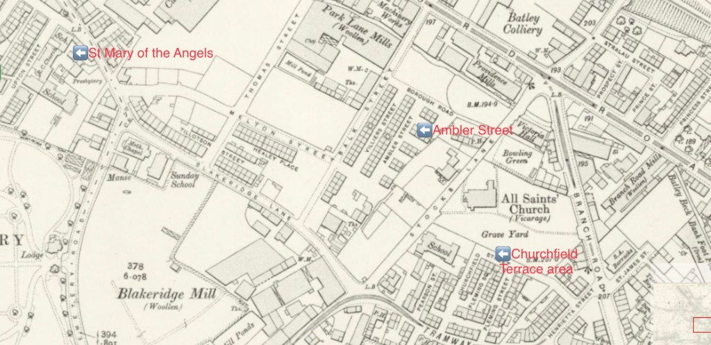 In 1891 the family address was Churchfield Terrace, Batley, but subsequent censuses saw them living at 10, Ambler Street, in the predominantly Irish Catholic Skelsey Row area of town. This was the family address at the time of Peter’s death.