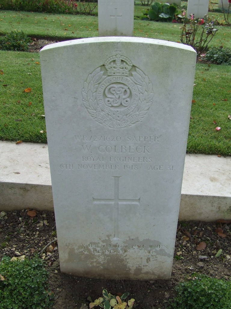 William Colbeck was initially laid to rest at Dury Hospital Military Cemetery, under the wall of the Asylum near the west side of the Amiens-Dury Road. The Asylum was used intermittently by British medical units between August 1918 to January 1919. After the Armistice, Villiers-Bretonneux Military Cemetery was created, bringing in graves from other burial grounds and concentrating them in this single, larger cemetery. William Colbeck’s remains were interred here in 1927. His headstone bears the following family inscription: