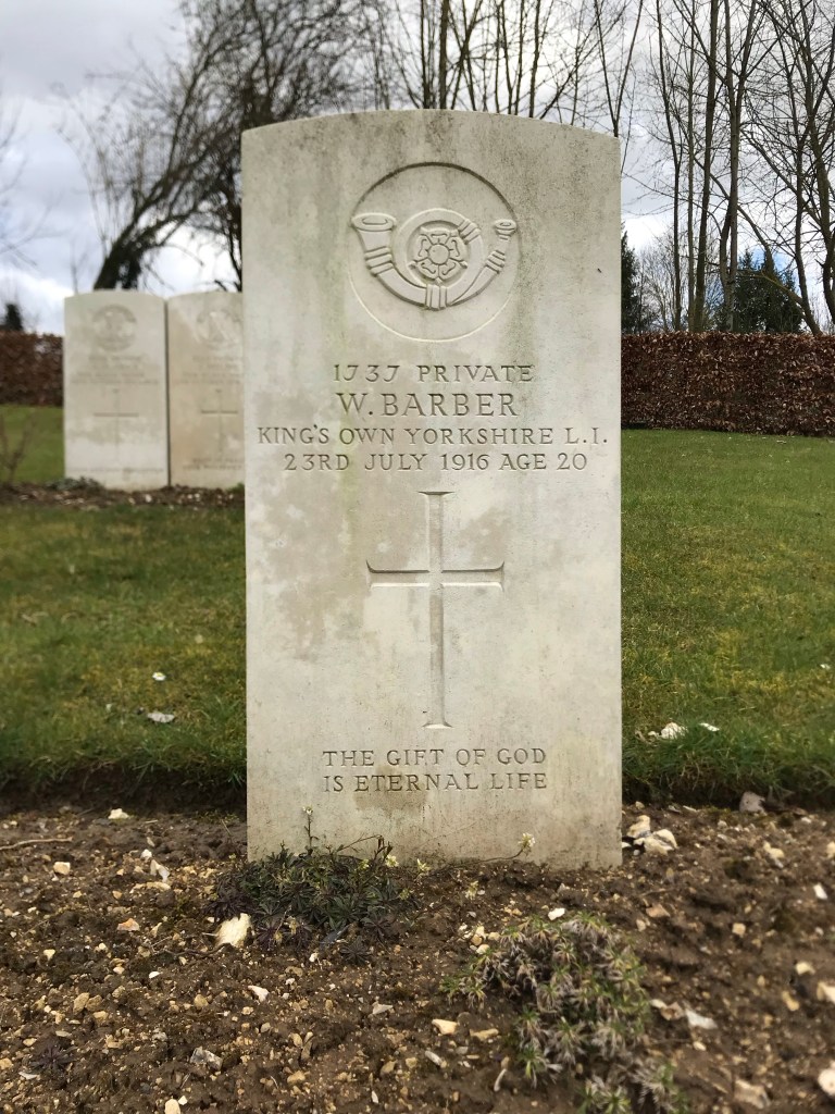 Some confusion exists about Willie’s date of death. Some sources indicate the early hours of 22 July. This is the date given in a letter to the family from a pal. This is also the date on family In Memoriam newspaper notices, and the date they provided to the Batley War Memorial committee. However the parish priest gave the same committee Willie’s date of death as 23 July 1916. This is also the date on official documentation, including his CWGC headstone.