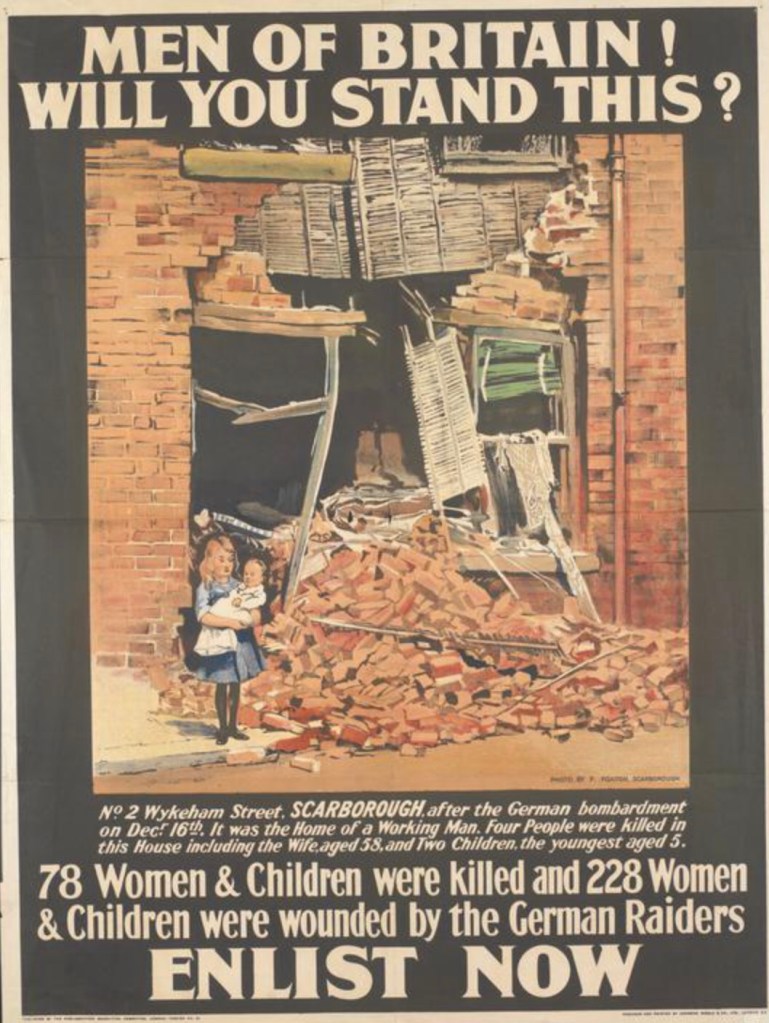 Men of England, the innocent victims of German brutality call upon you to avenge them. Show the German barbarians that Britain’s shores cannot be bombarded with impunity. Duty calls you now.