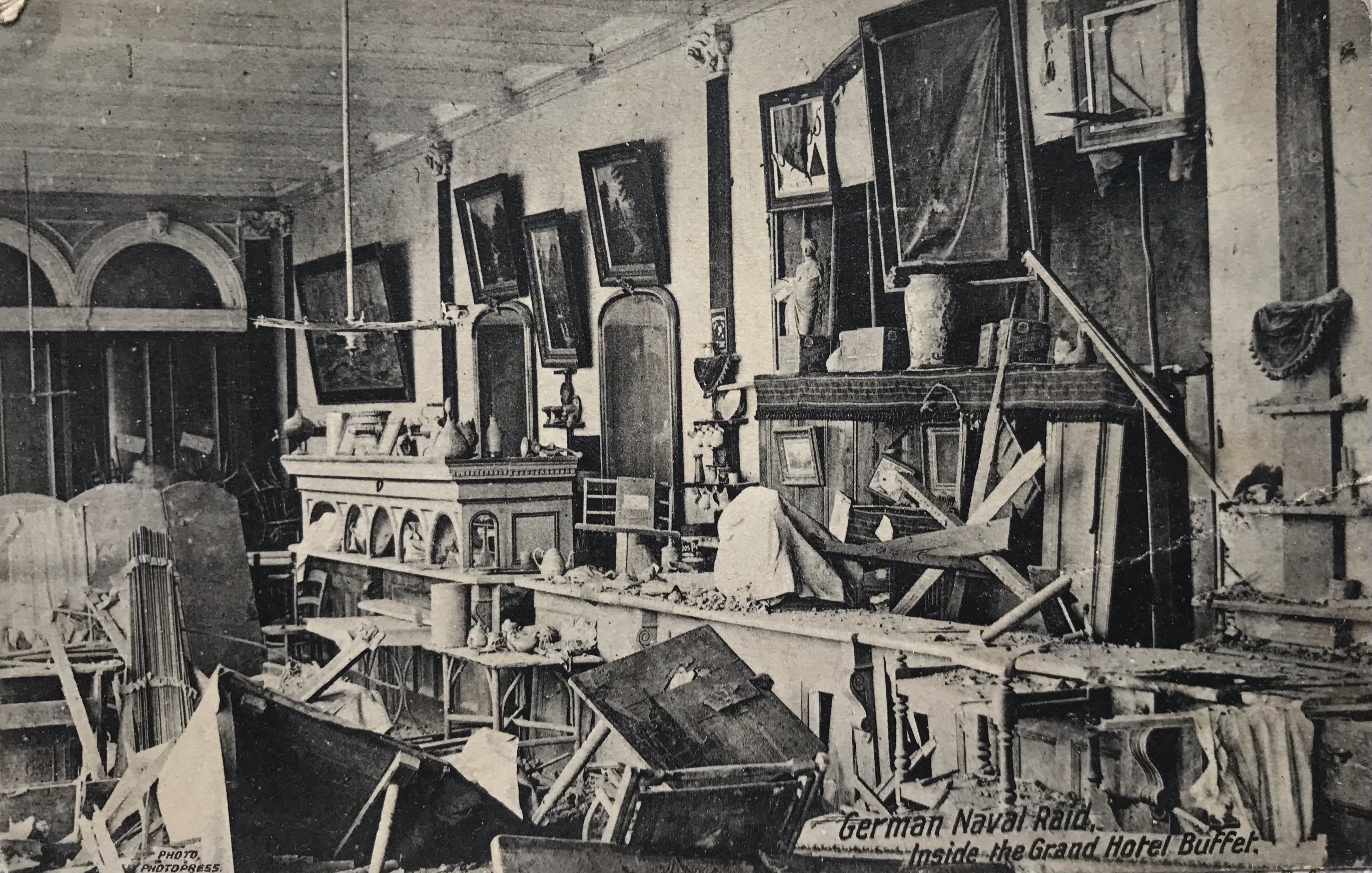 The attacks occurred from around 8 a.m. to 9.30 a.m. that morning. In the immediate aftermath, in scenes reminiscent of Belgium and France, refugees fled their homes seeking safety inland. Distressed residents from the stricken towns, some still in slippers and nightdresses, disembarked in local railway stations with tales of terror and destruction. Papers carried reports of “grave casualties”, “loss of life and serious damage” and “buildings battered and wrecked” with “churches as targets” as “undefended Yorkshire Coast towns” were shelled by the German Fleet.8 The historic landmarks of Whitby Abbey and Scarborough Castle suffered damage. Famous seaside hotels, like Scarborough’s Grand Hotel, bore shell scars.